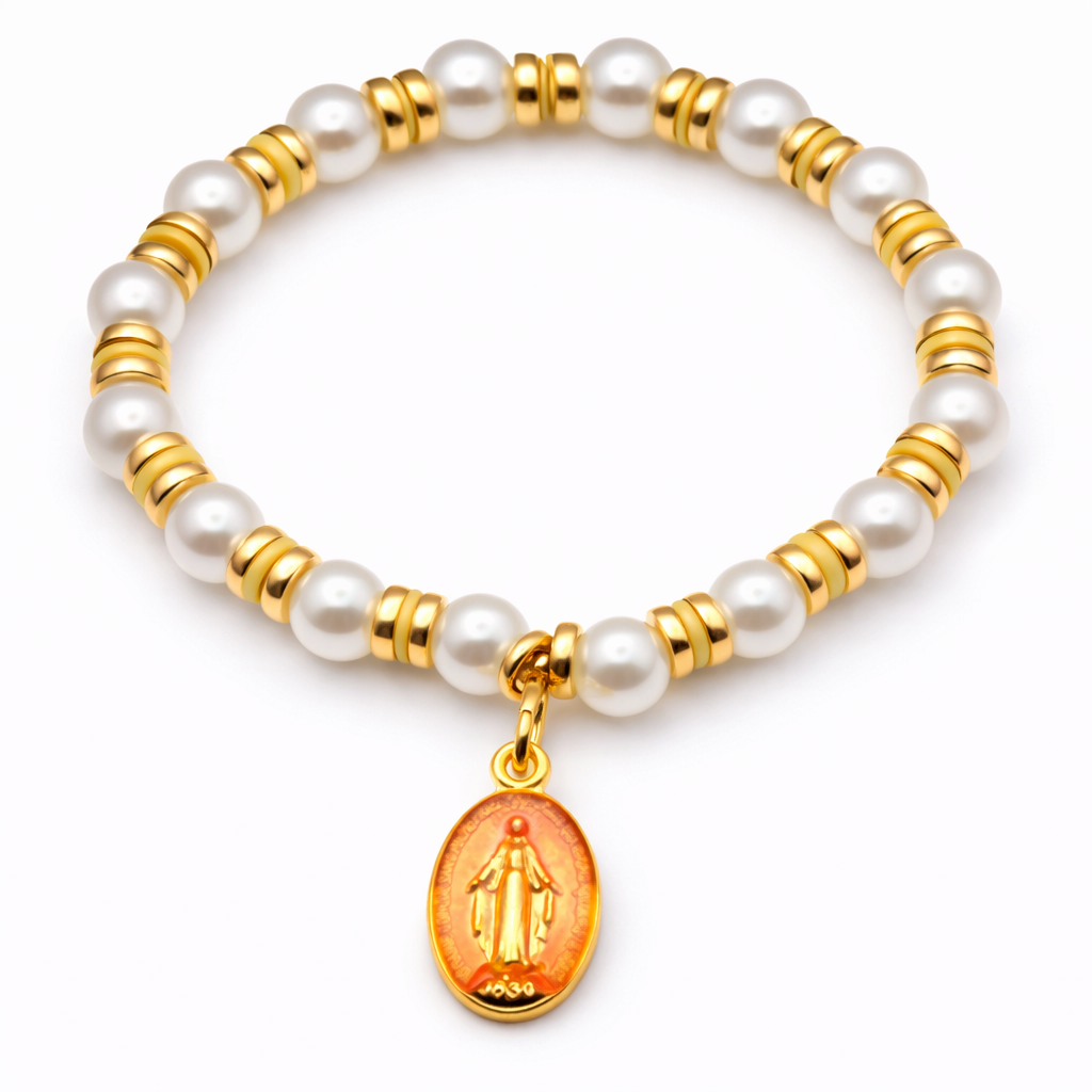 Ce bijou corse revisite le bracelet en perles avec une esthétique lumineuse : des perles synthétiques régulières, ponctuées d’intercalaires alternant éléments synthétiques et métal doré. En pendentif, une médaille en métal doré (fond orangé) apporte une signature visuelle forte tout en restant raffinée.